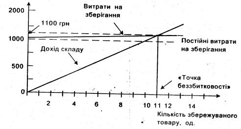 Логіст може розрахувати «точку беззбитковості» для будь-якого товару. Ця інформація служить йому швидким і простим засобом перевірки ефективності функціонування складу. Наприклад, якщо беззбитковість складу перевищує прогнози щодо можливих обсягів продажу готової продукції, то необхідно переглянути політику підприємства стосовно організації складського господарства. Дохід складу, витрати на зберігання, грн.