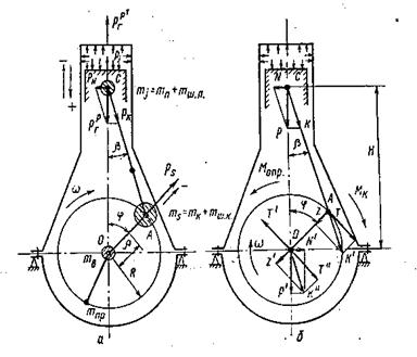 а – силы давления газов и силы инерции; б – суммарные, силы, действующие в звеньях и подшипниках коленчатого вала. Рисунок 2.4. Силы и моменты, действующие в центральном кривошипно–шатунном механизме