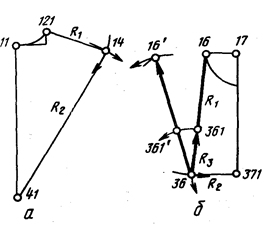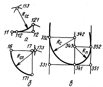 Способы определения положения конструктивных точек и построения криволинейных контуров деталей одежды необходимы при любой методике конструирования. При построении чертежей деталей одежды достаточно широкое распространение имеет способ определения положения конструктивных точек засечками дуг (рис. 2.5). Например, положение плечевой точки спинки (см. рис. 2.5, а) определяют на пересечении дуг двух радиусов: R1 = A2П (121-14) и R2 = ТП (41-14). Положение сосковой (выступающей) точки груди Г6.(см. рис. 2.5, б) в женской одежде определяют засечкой дуги радиуса R1 = A4 Г6 (16-36) на дуге радиуса R2 = ЦГ (371-36), где ЦГ — расстояние между выступающими точками грудных желез. Раствор верхней вытачки Г7Г71 (361-361!) откладывают на дуге радиуса R = Г6Г7 (36-361).
