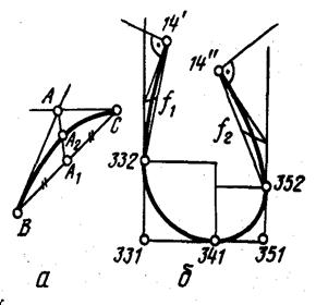 Построение лекальных кривых находит широкое применение главным образом при использовании приближенных методов конструирования. Чаще всего кривую проводят через три точки – начальную, конечную и одну промежуточную, лежащую на биссектрисе угла (например, кривая горловины спинки АА21А2 на рис. 2.6, а и кривая нижнего участка проймы П31Г2 и Г22П6 на рис. 2.6, б) или через точку, заданную стрелой прогиба кривой 3 — 4 (см. рис. 2.6, б). Для повышения точности построения таких кривых рекомендуется использовать специальные лекала. Радиусография применяется для оформления горловины полочки (рис. 2.7, а) RГ = A3A5 = A3A4 + (0,5 + 1), а также проймы спинки и полочки (рис. 2.7,б) Rc = 0,6Шпр; Rп = 0,4Шпр, где Шпр — ширина проймы. Графическое построение кривых второго порядка, аппроксимирующих контуры лекал деталей одежды, осуществляется с применением проективных дискриминантов кривой (рис. 2.8). Проективный дискриминант характеризует степень кривизны, кривой линии. Он определяется отношением отрезка A1A2, отсекаемого кривой на медиане треугольника AВС, образованного касательными к кривой в начальной и конечной точках, и хордой BC, к длине медианы AA2(f = A1A2/AA2). Пример использования проективных дискриминантов (f1=f4=0,5 и f2=f3=0,42) для построения линии среза проймы показан на рис.(2.8, б).