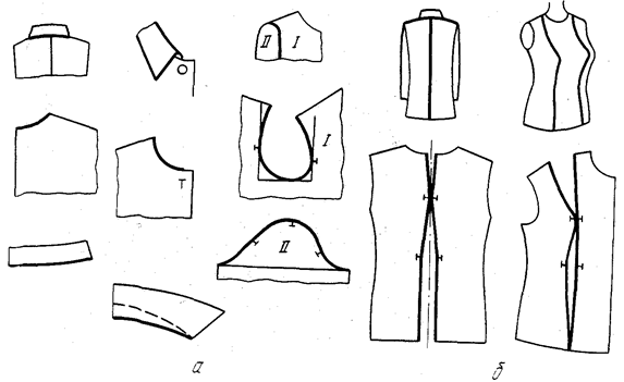 7. Линии перехода сопряжённых деталей одежды. Линиями перехода называют контурные линии членения, получающиеся от пересечения двух поверхностей или поверхности и плоскости. Линии членения в одежде могут проходить по границе различных поверхностей (рис. 2.9, а) и по наиболее выпуклым или вогнутым участкам одной поверхности (рис. 2.9, б). В первом случае форма линии перехода сопряженных деталей чаще всего получается совершенно различной (например, форма срезов проймы и оката рукава, горловины и стойки воротника); во втором случае форма линий перехода срезов смежных деталей сходная (например, боковые срезы спинки и полочки, срезы рельефов на спинке или полочке). При расположении линии членения деталей по линии симметрии фигуры (например, посередине спинки) линии перехода будут также симметричными. Операция соединения близких по форме срезов деталей, когда срезы совмещаются полностью или на больших участках, носит название стачивания (стачивание средних срезов спинки, боковых срезов спинки и полочки, рельефов спинки или полочки и т. д.).