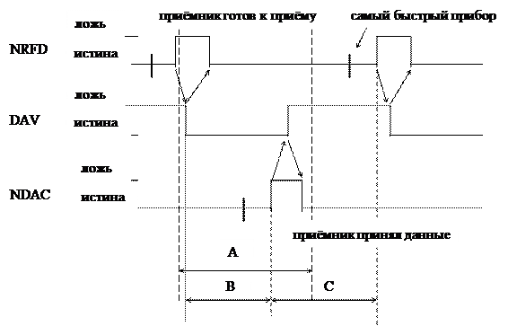 Сигналы NRFD, DAV и NDAC синхронизированы по отношению друг к другу так, как это указано стрелками на рисунке.