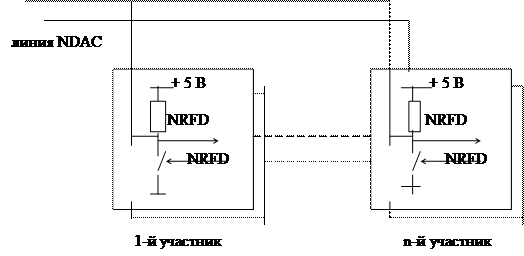 Если один или большее число участников ещё не готовы читать данные, то соответствующие ключи замкнуты. Таким образом, любое из устройств в состоянии удерживать единичное значение на линии NRFD шины IEEE-488 (низкий уровень), несмотря на то, что другие участники могут быть готовы (их ключи разомкнуты). Когда данный участник является источником, он устанавливает нулевое значение на линии NRFD перед тем, как выдать сигнал DAV.
