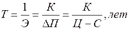 Де ДО - повна кошторисна вартість споруджуваного об'єкта Ц - річний випуск продукції в оптових коштовні підприємства по проекті С - собівартість річного випуску продукції після повного здійснення будівництва й уведення об'єкта на повну потужність Розрахований коефіцієнт економічної ефективності капітальних вкладень рівняється з нормативним коефіцієнт економічної ефективності капітальних вкладень 2. Строк окупності капітальних вкладень - величина зворотна коефіцієнту економічної ефективності капітальних вкладень і показує за скільки років капітальні вкладення можуть бути окуплені.
