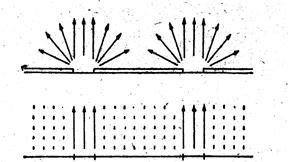 Основное испарение воды идет через устьица. При полностью открытых устьицах транспирация идет интенсивно и почти приравнивается к испарению воды со свободной поверхности такой же площади. Но вспомним, что при полностью открытых устьицах их общая поверхность составляет всего 1% от площади листа, т.е казалось бы, что транспирация должна быть в 100 раз меньше, чем испарение со свободной поверхности воды. Но измерение транспирации и испарения с одинаковой водной поверхности показало, что транспирация всего меньше в 2 раза. Для сравнительной активности транспирации введено понятие относительной транспирации, которая показывает, что транспирация не только более интенсивна, но и саморегулируемая . Относительная транспирация – это отношение транспирации к свободному испарению с водной поверхности той же площади и за то же времени. В среднем она составляет 0,2 -0,5, а у некоторых даже 0,9. Почему же так? Объяснение этому дали в 1900 году английские физиологи Браун и Эскомби, которые установили, что испарение из ряда мелких отверстий идет быстрее, чем и одного крупного той же площади. Согласно Закону Стефана, связанного с так называемым краевым эффектом. Испарение с краёв идет быстрее, чем в центре. В центре происходит насыщение паров сильнее и связь с молекулами прочнее, а с краёв вода легче отрывается и скорее рассеивается, вокруг краев создаётся свободное диффузное поле и пары расходятся веером (рис.). Поэтому при испарении таких краевых молекул значительно больше у ряда мелких отверстий, расположенных друг от друга не ближе 10- кратного расстояния их диаметра, так как испарение пропорционально не площади, а диаметру отверстия