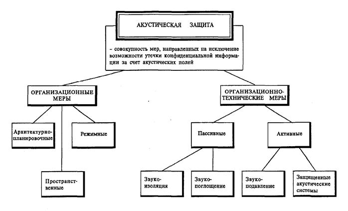 Защита информации от утечки по акустическому каналу — это комплекс мероприятий, исключающих или уменьшающих возможность выхода конфиденциальной информации за пределы контролируемой зоны за счет акустических полей. Основными мероприятиями в этом виде защиты выступают организационные и организационно-технические меры. Организационные меры предполагают проведение архитектурно-планировочных, пространственных и режимных мероприятий, а организационно-технические — пассивных (звукоизоляция, звукопоглощение) и активных (звукоподавление) мероприятий. Не исключается проведение и технических мероприятий за счет применения специальных защищенных средств ведения конфиденциальных переговоров (рис. 49). Архитектурно-планировочные меры предусматривают предъявление определенных требований на этапе проектирования зданий и помещений или их реконструкцию и приспособление с целью исключения или ослабления неконтролируемого распространения звуковых полей непосредственно в воздушном пространстве или в строительных конструкциях в виде структурного звука. Эти требования могут предусматривать как выбор расположения помещений в про-