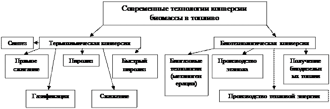 Термохимическая конверсия: 1) прямое сжигание – древнейшее использование биомассы, КПД – 15…18 %. Также существует такие внутренние биомассы, которые выгоднее сжигать при условии созданий тепловых агрегатов с высоким КПД (солома, злаковые культуры, стебли подсолнечника, кукурузы, некоторые виды древесины, ТБО); 2) пиролиз – термохимическая конверсия сырья без доступа воздуха при температуре 450 - 5500С (перегонка). Из 1м3 абсолютно сухой древесины можно получать 140 – 180 кг древесного угля, не содержащего серы, фосфора и используется для получения лучших сортов стали, при этом также получается 280 – 400 кг жидких продуктов (метанол, ацетон) и 80 кг горючих газов (метан, водород); 3) газификация – это неполное сжигание биомассы при температуре 900 – 15000С в присутствии кислорода (или воздуха и воды) в результате чего получается синтез-газ (СО+Н2), 7% стеклообразной массы, применяемые для дорожных покрытий. Газификация более прогрессивный и экономичный способ конверсии биомассы, чем пиролиз, также может использоваться для получения метанола; 4) сжижение – производство жидкого синтетического топлива путем термической конверсии в присутствии катализатора; 5) быстрый пиролиз – биомасса в течении короткого времени подвергается воздействию высоких температур ~ 15000С, следовательно, быстрое разложение исходных продуктов и образование этанола и других продуктов близких к бензину. Использование быстрого пиролиза выгоднее, чем простого, так как получается меньше золы; 6) синтез – это метанол в присутствии катализатора при нагреве (из 1 т древесины можно получить около 500 л метанола – как бы перегонка). Наиболее эффективным способом является быстрый пиролиз.