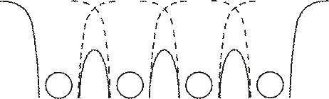 После сближения отдельных атомов на расстояние межатомного взаимодействия образуется потенциальная диаграмма со слитыми и пониженными границами потенциальной энергии между соседними атомами. Если температура кристалла не рана 0 К, то расстояние между атомами постоянно изменяется, то есть, атомы колеблются. Поэтому в каждый фиксированный момент времени немного отклоняется от изображённой на рисунке 9. При сближении атомов энергия потенциального барьера между ними понижается, а при удалении – повышается. При образовании кластера, состоящего из двух атомов, электронные оболочки этих атомов взаимодействуют между собой, частично перекрываются, при этом фактически возникает ситуация, когда в одной точке пространства находятся уже не 2, а 4 электрона с одинаковой энергией, что противоречит постулату III. Следовательно, при образовании кластера каждый энергетический уровень расщепляется на 2 близко лежащих по оси энергии подуровня. При присоединении третьего – на 3, и так далее. Если мы имеем 1 см3 кристаллического вещества, то каждый энергетический уровень будет расщеплён 1022 – 1023 подуровней (по числу атомов), расстояние между ними находится в пределах 10-16 – 10-25 эВ. [ 1 электрон-вольт – энергия, необходимая для перемещения 1 электрона в электрическом поле с напряжённостью 1 вольт] Энергия 10-25 эВ пренебрежимо мала, поэтому считается, что в кристалле каждый энергетический уровень расщепляется в квазисплошную разрешённую для пребывания электронов энергетическую зону.