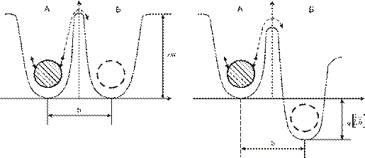 1. Электрическое поле не способно непосредственно перенести носитель заряда из одного положения в другое. 2. Электрическое поле только нарушает симметрию потенциальных диаграмм. Следовательно, вероятности нахождения заряда в различных положениях различны. 3. Носитель заряда совершает колебательные движения в положении равновесия с частотой 4. Направленное движение будет обусловлено неодинаковой частотой прыжков вправо и влево, что обусловлено разной высотой энергетических барьеров. Влево: