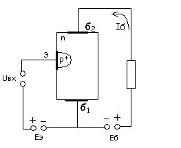 Принцип включения: Б1, Б2 включаются так, чтобы основные носители двигались от Б1 к Б2, p-n-переход Б1-Э включается в прямом направлении.