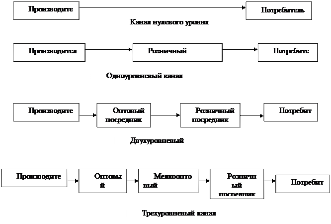 Рисунок 2 – Каналы распределения товаров разных уровней Традиционные каналы распределения состоят из независимого производителя и одного или нескольких независимых посредников. Каждый член канала представляет собой отдельное предприятие, стремящееся обеспечить себе максимальную прибыль. Примеры традиционных каналов распределения: · канал нулевого уровня (производитель- потребитель); · одноуровневый канал (производитель – розничный посредник – потребитель); · двухуровневый канал (производитель – оптовый посредник – розничный посредник – потребитель); · трехуровневый канал (производитель – оптовый посредник – мелкооптовый посредник – розничный посредник – потребитель). При данном канале распределения ни один из членов канала не имеет полного или достаточного контроля над деятельностью остальных членов – такой канал называют горизонтальным. Вертикальный канал распределения – это канал, состоящий из производителя и одного или нескольких посредников, действующих как одна единая система. Один из членов канала, как правило, либо является собственником остальных компаний участниц, либо представляет им определенные привилегии. Таким членом может быть производитель, оптовый или розничный посредник. Вертикальные каналы возникли как средство контроля за поведением канала. Они экономичны и исключают дублирование членами канала выполняемых функций. При формировании канала распределения товара на первое место выдвигаются решения о структуре канала, т.е. о количестве уровней канала и конкретном составе членов канала. При выявлении возможных вариантов каналов распределения необходимо определиться с типом используемых посредников. Классифицируют посредников по сочетанию двух признаков: 1) от чьего имени работает посредник; 2) за чей счет посредник ведет свои операции. Выделяют пять типов посредников: Дилеры – это посредники, которые ведут операции от своего имени и за свой счет. Товар приобретается ими по договору поставки. Таким образом, дилер становиться собственником продукции после полной оплаты поставки. Отношения между производителем и дилером прекращаются после выполнения всех условий по договору поставки. Однако взаимоотношения производителя с дилерами в последнее время приобретают разнообразные формы из-за желания производителя формировать вертикальные каналы распределения. При этом дилеры становятся держателями привилегий, объединяя в своих руках ряд последовательных этапов процесса производства и распределения. В сбытовой цепи дилеры занимают положение, наиболее близкое к конечным потребителям. Различают два вида дилеров. Эксклюзивные дилеры являются единственными представителями производителя в данном регионе и наделены исключительными правами по реализации его продукции. Дилеры, сотрудничающие с производителем на условиях франшизы, именуются авторизованными. Дистрибьюторы – посредники, ведущие операции от имени производителя и за свой счет. Как правило, производитель предоставляет дистрибьютору право торговать своей продукцией на определенной территории и в течение определенного срока. Таким образом, он не является собственником продукции. По договору им приобретается право продажи продукции. Дистрибьютор может действовать и от своего имени. В этом случае в рамках договора 