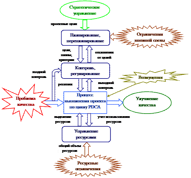 Рис. 1.2. Выполнение проекта и место оперативного управления проектом Функция управления проектом существует в любом случае, но не всегда имеется отдельное подразделение, несущее ответственность за нее. Управление может быть определено как организация взаимодействия элементов таким образом, чтобы достичь заданной цели. Хорошо известны функции оперативного управления: планирование, регулирование, поддержание. В деталях модель оперативного управления на основе обратной связи представлена на рис. 1.3.