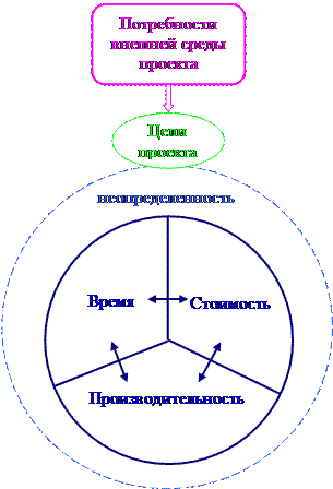Рис. 1.3. Модель оперативного управления проектом В ходе оперативного управления проектом оценивается степень его выполнения путем измерения того, в какой мере потребности участников удовлетворены в ходе всего процесса. При этом следует учитывать возможность изменения потребностей. Единицами измерения являются: производительность (количество, качество); время; стоимость, которые сильно взаимосвязаны так, что каждая их пара имеет свои взаимные связи (рис. 1.4). В процессе планирования проекта эти параметры используются в довольно определенной последовательности один за другим, но оптимизация и контроль возможны только в том случае, если мы используем их совместно. Существование взаимосвязей трех параметров становится особенно очевидным на стадии оценки продолжительности работы: невозможно оценить время без учета производительности и стоимости одновременно.
