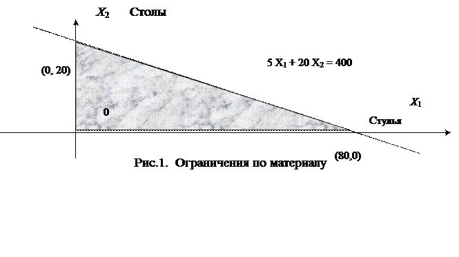 Среди оптимизационных задач наиболее известны задачи линейного программирования, в которых максимизируемая функция F (X) является линейной, а ограничения А задаются линейными неравенствами. Начнем с примера. Производственная задача. Цех может производить стулья и столы. На производство стула идет 5 единиц материала, на производство стола - 20 единиц (футов красного дерева). Стул требует 10 человеко-часов, стол - 15. Имеется 400 единиц материала и 450 человеко-часов. Прибыль при производстве стула - 45 долларов США, при производстве стола - 80 долларов США. Сколько надо сделать стульев и столов, чтобы получить максимальную прибыль? Обозначим: Х 1 - число изготовленных стульев, Х 2 - число сделанных столов. Задача оптимизации имеет вид: 45 Х 1 + 80 Х 2 → max, 5 Х 1 + 20 Х 2 ≤ 400, 10 Х 1 + 15 Х 2 ≤ 450, Х 1 ≥ 0, Х 2 ≥ 0. В первой строке выписана целевая функция - прибыль при выпуске Х 1 стульев и Х 2 столов. Ее требуется максимизировать, выбирая оптимальные значения переменных Х1 и Х 2 . При этом должны быть выполнены ограничения по материалу (вторая строчка) - истрачено не более 400 футов красного дерева. А также и ограничения по труду (третья строчка) - затрачено не более 450 часов. Кроме того, нельзя забывать, что число столов и число стульев неотрицательны. Если Х 1 = 0, то это значит, что стулья не выпускаются. Если же хоть один стул сделан, то Х 1 положительно. Но невозможно представить себе отрицательный выпуск - Х 1 не может быть отрицательным с экономической точки зрения, хотя с математической точки зрения такого ограничения усмотреть нельзя. В четвертой и пятой строчках задачи и констатируется, что переменные неотрицательны. Условия производственной задачи можно изобразить на координатной плоскости. Будем по горизонтальной оси абсцисс откладывать значения Х 1, а по вертикальной оси ординат - значения Х 2. Тогда ограничения по материалу и последние две строчки оптимизационной задачи выделяют возможные значения (Х 1, Х 2) объемов выпуска в виде треугольника (рис.1). Таким образом, ограничения по материалу изображаются в виде выпуклого многоугольника, конкретно, треугольника. Этот треугольник получается путем отсечения от первого квадранта примыкающей к началу координат зоны. Отсечение проводится прямой, соответствующей второй строке исходной задачи, с заменой неравенства на равенство. Прямая пересекает ось Х 1, соответствующую стульям, в точке (80,0). Это означает, что если весь материал пустить на изготовление стульев, то будет изготовлено 80 стульев. Та же прямая пересекает ось Х 2, соответствующую столам, в точке (0,20). Это означает, что если весь материал пустить на