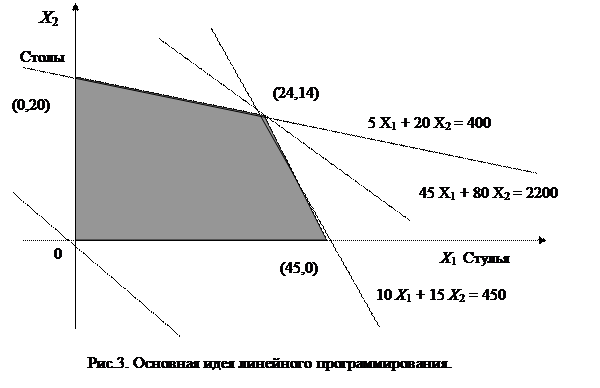 Таким образом, ограничения по труду, как и ограничения по материалу, изображаются в виде треугольника. Этот треугольник также получается путем отсечения от первого квадранта примыкающей к началу координат зоны. Отсечение проводится прямой, соответствующей третьей строке исходной задачи, с заменой неравенства на равенство. Прямая пересекает ось Х1, соответствующую стульям, в точке (45,0). Это означает, что если все трудовые ресурсы пустить на изготовление стульев, то будет сделано 45 стульев. Та же прямая пересекает ось Х2, соответствующую столам, в точке (0,30). Это означает, что если всех рабочих поставить на изготовление столов, то будет сделано 30 столов. Для всех точек внутри треугольника выполнено неравенство, а не равенство - часть рабочих будет простаивать. Мы видим, что очевидного решения нет - для изготовления 80 стульев есть материал, но не хватает рабочих рук, а для производства 30 столов есть рабочая сила, но нет материала, Значит, надо изготавливать и то, и другое. Но в каком соотношении? Чтобы ответить на этот вопрос, надо "совместить" рис.1 и рис.2, получив область возможных решений, а затем проследить, какие значения принимает целевая функция на этом множестве (рис.3).