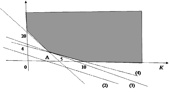 На рис.4 ради облегчения восприятия четыре прямые обозначены номерами (1) - (4). Прямая (1) - это прямая 1,00 К + 0,25 С = 5,00 (ограничение по веществу Н). Она проходит, как и показано на рисунке, через точки (5,0) на оси абсцисс и (0,20) на оси ординат. Обратите внимание, что допустимые значения параметров (К, С) лежат выше прямой (1) или на ней, в отличие от ранее рассмотренных случаев в предыдущей производственной задаче линейного программирования. Прямая (2) - это прямая 110,00 К + 120,00 С = 400,00 (ограничение по калориям). Обратим внимание, что в области неотрицательных С она расположена всюду ниже прямой (1). Действительно, это верно при К=0, прямая (1) проходит через точку (0,20), а прямая (2) - через расположенную ниже точку (0, 400/120). Точка пересечения двух прямых находится при решении системы уравнений 1,00 К + 0,25 С = 5,00, 110,00 К + 120,00 С = 400,00. Из первого уравнения К = 5 - 0,25 С. Подставим во второе: 110 (5- 0,25 С) + 120 С = 400, откуда 550 - 27,5 С + 120 С = 400. Следовательно, 150 = - 92,5 С, т.е. решение достигается при отрицательном С. Это и означает, что при всех положительных С прямая (2) лежит ниже прямой (1). Значит, если выполнено ограничения по Н, то обязательно выполнено и ограничение по калориям. Мы столкнулись с новым явлением - некоторые ограничения с математической точки зрения могут оказаться лишними. С экономической точки зрения они необходимы, отражают существенные черты постановки задачи, но в данном случае внутренняя структура задачи оказалась такова, что ограничение по калориям не участвует в формировании допустимой области параметров и нахождении решения. Прямая (4) - это прямая 0,1 К + 0,25 С = 1 (ограничение по веществу Т). Она проходит, как и показано на рисунке, через точки (10,0) на оси абсцисс и (0,4) на оси ординат. Обратите внимание, что допустимые значения параметров (К, С) лежат выше прямой (4) или на ней, как и для прямой (1). Следовательно, область допустимых значений параметров (К, С) является неограниченной сверху. Из всей плоскости она выделяется осями координат (лежит в первом квадранте) и прямыми (1) и (4) (лежит выше этих прямых, а также включает граничные отрезки). Область допустимых значений параметров, т.е. точек (К, С), можно назвать "неограниченным многоугольником". Минимум целевой функции 3,8 К + 4,2 С может достигаться только в вершинах этого "многоугольника". Вершин всего три. Это пересечения с осями абсцисс (10,0) и ординат (0,20) прямых (1) и (4) (в каждом случае из двух пересечений берется то, которое удовлетворяет обоим ограничениям). Третья вершина - это точка А пересечения прямых (1) и (4), координаты которой находятся при решении системы уравнений 0,10 К + 0,25 С = 1,00, 1,00 К + 0,25 С = 5,00. Из второго уравнения К = 5 - 0,25 С, из первого 0,10 (5 - 0,25 С) + 0,25 С = 0,5 - 0,025 С + 0,25 С = 0,5 + 0,225 С = 1, откуда С = 0,5/0,225 = 20/9 и К = 5 - 5/9 = 40/9. Итак, А = (40/9; 20/9). Прямая (3) на рис.4 - это прямая, соответствующая целевой функции 3,8 К + 4,2 С. Она проходит между прямыми (1) и (4), задающими ограничения, и минимум достигается в точке А, через которую и проходит прямая (3). Следовательно, минимум равен 3,8х40/9 + 4,2х20/9 = 236/9. Задача об оптимизации смеси полностью решена. Двойственная задача, построенная по описанным выше правилам, имеет приведенный ниже вид (мы повторяем здесь и исходную задачу об оптимизации смеси, чтобы наглядно продемонстрировать технологию построения двойственной задачи):