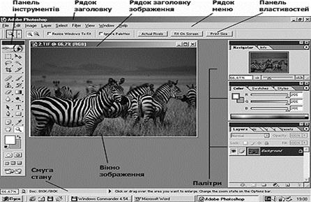 - рядок заголовку; - рядок меню; - рядок заголовку зображення; - смуга стану; - вікно зображення; - панель інструментів; - панель властивостей; - палітри; - смуги прокручування. Так само, як і в більшості інших прикладних програм, у процесі вашої роботи над документом-зображенням на екрані Photoshop поряд з перерахованими елементами відображаються різноманітні вікна діалогу. Розглянемо деякі елементи керування, а також інструменти, використання яких має специфічні особливості.