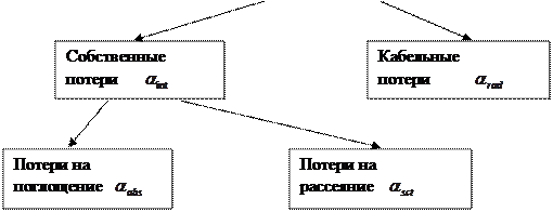 Волокно характеризуется двумя важнейшими параметрами: затуханием и дисперсией. Чем меньше затухание (потери) и чем меньше дисперсия распространяемого в волокне сигнала, тем больше может быть расстояние между переприемными участками. На затухание света в волокне влияют такие факторы, как потери на поглощение, потери на рассеяние и кабельные потери. Потери на поглощеяние и на рассеяние вместе называют собственными потерями, в то время, как кабельные потери в силу их природы называют дополнительными потерями, рис 1.3.