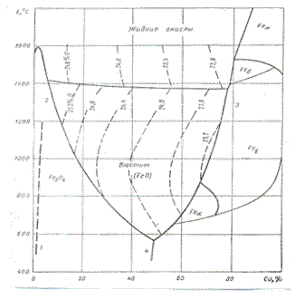 Рис.3. Диаграмма равновесии окислов железа с газовой фазой из Н₂ и Н₂О.