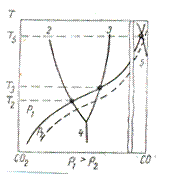 Рис.5. Сочетание равновесных кривых реакций газификации углерода и восстановления окислов железа. При температуре Т2 реализуется равновесное сложной системе Fe3O4+ FeO-С-СО- СО2 a при Т3 Системы FeO- Fe-С-СО- СО2 При понижении давления в системе равновесия кривая газификации углерода смещается к более низким температурам. В полном согласии с общем выражением (3,65) при этом понижаются температуры, при которых начинается реагирование углерода. Аналитически рассматриваемые зависимости можно представить на основе температурных функций констант равновесия реакции восстановления окислов и газификаций углерода: Кр= РСО2/РСО=¦(Т); Кр(4,1)= РСО РСО2+РСО=Р; Совместное решение уравнений позволяет рассчитать температуру начало реагирование углерода для заданного давления и состав равновесной газовой фазы. Таким путем можно предвидеть условия прямого восстановления других окислов в зависимости от их природы. С повышением прочности окисла понижается его кислородный потенциал и, как показывает соотношение (32), возрастает содержание восстановителя в равновесной газовой фазе. Кривая равновесия восстановления окисла приближается к оси 100%-ного содержания СО, что выражает низкую эффективность использования восстановителя (рис.5). При этом значительно возрастает температура начало прямого восстановления при участие углерода, например Т5 для кривой 5, представленной на графике в увеличенном масштабе. В этом случае можно существенно улучшить термодинамических условия восстановительных процессов путем применение вакуума. Как показывают качественные зависимости и количественные расчеты на основе уравнений (39), разрежение в системе понижает температуру начало прямого восстановления и обеспечивает более полное использование восстановителя. Эти общее закономерности служит предпосылками вакуумной металлургии при получение металлов с повышенном сродством к кислороду. Аналогичном образе можно выявить условия развитие окислительных процессов при наличие в системе избытка углерода: Для реагирующих окислов РСО.(г.ф)< РСО(р). Для реакции углерода РСО.(г.ф)> РСО(р), Такие условие реализуется при температурах ниже точек пересечения равновесных кривых (рис.5) и обусловливает окислительные процессы: В области Т2-Т3 Fe® (FeO); и ниже Fe® (FeO); (FeO) ® Fe3O4; несмотря на присутствие избытка твердого углерода. Рассмотренные закономерности опираются на термодинамику макросистемы, и выражает его свойства в целом. Однако для твердого углерода известны сильно развитые поверхностные явления. Твердый углерод адсорбирует большие объемы кислорода и выделяет при небольшом повышении температуры газ, богатый СО. С другой стороны, прочные межатомные связи в решетке графита нарушаются благодаря внедрению в межбазисное пространство посторонних частиц. Подобного рода явление могут быть причиной местного активирования прямого восстановления окисла и кинетического температуры начала процесса могут отличаться от термодинамических. В этом отношении интересны исследования В.П. Елютина и Ю.А. Павлова. Восстановителем служил радиоактивный изотоп углерода, а начало взаимодействия определяли по появлению радиоактивности в газообразных продуктов реакции. Найденные температуры начала восстановления увеличиваются при переходе от одного окисла к другому в порядке повышения термод