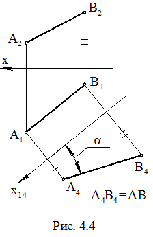 Введем новую плоскость проекций П4 параллельно отрезку АВ и перпендикулярно П1. При этом новая ось x14 будет параллельна А1В1 (в противном случае прямая АВ и плоскость П4 пересекутся). Угол наклона отрезка АВ к плоскости П4 равен нулю, и АВ на П4 проецируется в натуральную величину, т.е. А4В4 = АВ. Измерив отрезок А4В4, получим длину отрезка АВ. Каждая из точек А4 и В4 строилась с использованием правила замены плоскостей проекций. Расстояние между А1В1 и x14 не влияет на величину А4В4, и поэтому может быть взято произвольно. В результате введения П4 выполнен переход от системы (П1П2) к системе (П1П4), в которой прямая АВ, проходящая через отрезок АВ, является линией уровня. На плоскости П4 (рис. 4.4) кроме А4В4 = АВ получили угол a, который равен углу между АВ и плоскостью П1, так как плоскость этого угла параллельна плоскости П4. Если ввести новую плоскость П5 параллельно АВ и перпендикулярно П2, то новая ось x25 будет параллельна А2В2. Получим А5В5 = АВ и угол b, который равен углу между АВ и плоскостью П2, так как плоскость этого угла параллельна плоскости П5.