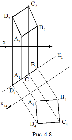 В случае, когда дана проецирующая плоскость, построений, связанных с натуральной величиной фигуры, конечно, меньше, так как плоскость уже проецируется в прямую линию. На рис. 4.8 показано построение квадрата, принадлежащего горизонтально проецирующей плоскости. Пусть дана горизонтально проецирующая плоскость S(S1) и две точки этой плоскости А(А1, А2) и В(В1, В2). Необходимо построить квадрат ABCD в плоскости S. Соединяем отрезками проекции А2,В2 и А1,В1. Получили проекции стороны квадрата. Вводим плоскость П4 // S1 (x14 // S1). Строим новую проекцию А4В4. Достраиваем к отрезку А4В4 квадрат А4В4С4D4. Проекции С1 и D1 принадлежат S1. Проекции С2 и D2 строятся по правилам замены плоскостей проекций. У этой задачи есть второе решение – квадрат, симметричный построенному относительно прямой (АВ). Это второе решение можно построить, не пользуясь проекцией на плоскость П4 сразу на плоскостях П2 и П1.