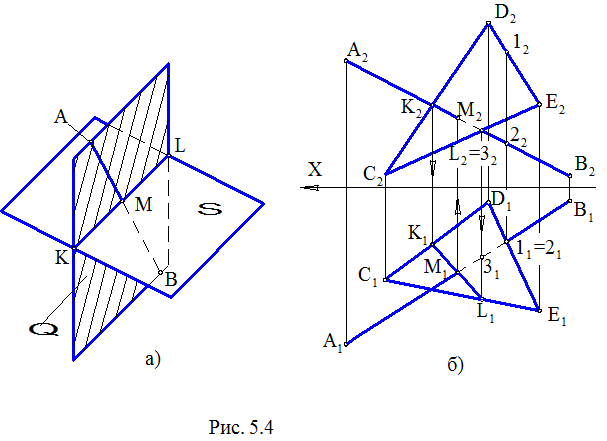 1) на заданной плоскости S(DCDE) проведем проекции прямой KL (рис. 5.4, б), конкурирующей с заданной прямой AB относительно плоскостей S и Π2; сначала находим K2L2, а затем K1L1; прямые KL и AB расположены во фронтально-проецирующей плоскости; 2) находим точки M1=K1L1ÇA1B1 и M2ÎA2B2 пересечения проекций прямых AB и KL; точка M(M1,M2) – искомая; 3) определяем видимость прямой и плоскости относительно плоскостей проекций.
