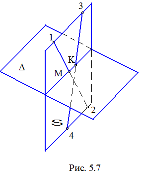 5.4.2. Пересекающиеся плоскости Линия пересечения двух плоскостей определяется · двумя точками, каждая из которых принадлежит обеим плоскостям; · одной точкой, принадлежащей двум плоскостям, и известным направлением линии. В обоих случаях задача заключается в нахождении точек, общих для двух плоскостей. Задача на пересечение двух плоскостей называется второй позиционной задачей. Она может быть сведена к решению первой позиционной задачи, рассмотренной ранее, по одному из следующих вариантов. Вариант 1. 1) В одной из плоскостей, например S (рис. 5.7), выбирают две произвольные прямые 12 и 34; 2) определяют точки M и K пересечения этих прямых с другой плоскостью – D; точки M и K задают искомую прямую.