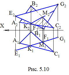 При взгляде на плоскость П2 по горизонтальной проекции видно, что часть треугольника ABC находится перед плоскостью D. Следовательно, на П2 треугольник K2C2M2 является видимым. Он выделен штриховкой. Видимыми на П2 а, соответственно выделены штриховкой, и треугольники плоскости S в окрестностях точек A2 и B2. Это связано с тем, что они находятся вне треугольника EFG и им не перекрываются при взгляде на П2.