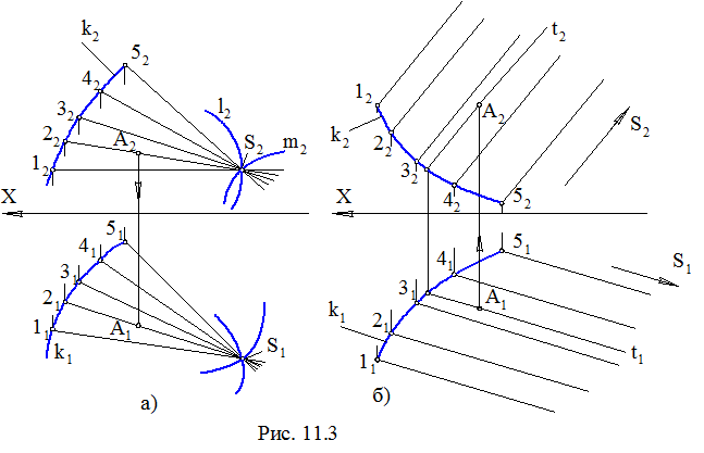 Коническая поверхностьобразуется движением прямолинейной образующей по криволинейной направляющей. При этом образующая проходит через некоторую неподвижную точку S, которая называется вершиной (рис. 11.3, а). Коническая поверхность является частным случаем линейчатых поверхностей общего вида, когда две направляющие, например l и m, пересекаются в точке S. Геометрическая часть определителя конической поверхности включает направляющую k и вершину S. В зависимости от вида направляющей коническая поверхность может быть замкнутой и незамкнутой. Цилиндрическая поверхность получается в том случае, когда все прямолинейные образующие проходят через направляющую k и пересекаются в несобственной точке S (рис. 11.3, б). Геометрическая часть определителя конической поверхности включает направляющую k и несобственную вершину S (направляющий вектор). Цилиндрическая поверхность также может быть незамкнутой или замкнутой. Точка А принадлежит данным поверхностям, так как она принадлежит образующим этих поверхностей. На конической поверхности она принадлежит образующей 2S, а на цилиндрической – образующей t.