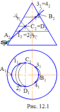 Пример 1. Построить проекции сечения кони-ческой поверхности вращения с фронтально-проеци-рующей плоскостью S (рис. 12.1). Решение. Заданная плоскость S пересекает исходную поверхность по эллипсу, фронтальная проекция которого расположена на следе этой плоскости. Горизонтальную проекцию сечения строим по точкам в соответствии с задачей на принадлежность линии поверхности (см. рис. 12.1).