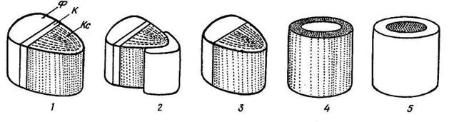Рис. 3.29. Типы проводящих пучков: 1 – открытый коллатеральный; 2 – открытый биколлатеральный; 3 – закрытый коллатеральный; 4 – концентрический закрытый центрофлоэмный; 5 – концентрический закрытый центроксилемный; К – камбий; Кс – ксилема; Ф – флоэма.
