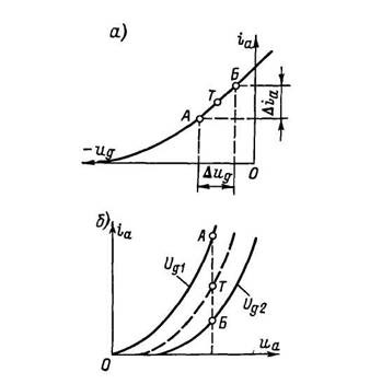 Параметры. К параметрам триода относится напряжение накала UH и ток накала IН, а также нормальное постоянное анодное и сеточное напряжение и соответствующий имК параметрам триода относится напряжение накала U H и ток накала I Н, а также нормальное постоянное анодное и сеточное напряжение и соответствующий им постоянный анодный ток. Важными являются максимальные допустимые параметры: мощность, выделяемая На аноде (Р amax), мощность, выделяемая на сетке (Р gmax ), анодное напряжение Uamax, напряжение между катодом и подогревателем UК-Пmax, предельный ток катода I кmax Для импульсных триодов указывают максимальный допустимый импульс анодного и катодного тока. Параметры триода, определяющие его свойства и возможности применения,— это крутизна характеристики (короче, крутизна), внутреннее сопротивление и коэффициент усиления либо проницаемость. Эти параметры характеризуют работу лампы без нагрузки. Их обычно называют статическими. Крутизна S характеризует управляющее действие сетки, т. е. влияние сеточного напряжения на анодный ток. Если при изменении сеточного напряжения Δ иg анодный ток изменяется на Δ i a, то S = Δ i a / Δ иg при иa = const. (17.10) Таким образом, крутизна есть отношение изменения анодного тока к вызвавшему его изменению сеточного напряжения при постоянном анодном напряжении. Условие иa = const необходимо для того, чтобы крутизна характеризовала действие только сеточного напряжения. Крутизна лампы аналогична параметру биполярного транзистора у 21э или крутизне полевого транзистора. Выражают крутизну в миллиамперах на вольт или амперах на вольт. Крутизна показывает, на сколько миллиампер (ампер) изменяется анодный ток при изменении сеточного напряжения на один вольт, если анодное напряжение постоянно. Например, если Δ иg = 2 В и Δ ia = 6 мА, то S = 6: 2 = 3 мА/В. В отличие от диода крутизна триода хотя и выражается в единицах проводимости, но не представляет собой внутреннюю проводимость участка сетка — катод. Современные триоды имеют крутизну 1 — 50 мА/В. Чем больше крутизна, тем лучше лампа, так как сильнее управляющее действие сетки. В большинстве случаев крутизна составляет единицы миллиампер на вольт. Для триода с плоскими электродами, работающего при иg < 0, по закону степени трех вторых получается выражение для крутизны S = 3,5·10-6 Q a/ d g-к2 √ u g + Du a. (17.11) Крутизна увеличивается при повышении напряжений сетки и анода, при увеличении площади поверхности анода и уменьшении расстояния сетка — катод. Чем меньше dg.K, тем сильнее влияние сетки на потенциальный барьер около катода. Если сетку делать более редкой, то проницаемость D увеличивается и по формуле (17.11) получается, что крутизна должна возрастать. Но на самом деле для каждого значения d g-к существует наивыгоднейшая густота сетки, при которой крутизна максимальна.