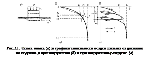 На рисунке (рис. 2.1. б) видно, что грунтам свойственна нелинейная деформируемость, причем в некотором начальном интервале изменения напряжений от 0 до Р1 она достаточна близка к линейной. При нагружении и последующей разгрузки штампа общая осадка грунта может быть разделена на восстанавливающуюся (упругую) Пластические деформации в грунтах можно разделить на объемные и сдвиговые. Объемные деформации приводят к изменению объема пор в грунте, т.е. к его уплотнению, сдвиговые – к изменению его первоначальной формы и могут вызвать разрушение грунта.