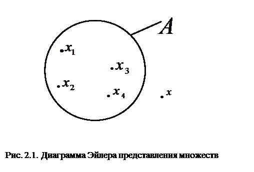 Понятие универсального множества чётко не определено, т.е. не корректно. Одно универсальное множество можно включить в другое множество, которое также будет универсальным. Множество называется конечным, если число его элементов конечно. Множество называется бесконечным, если количество его элементов бесконечно. Обычно множества обозначают прописными буквами латинского алфавита, а элементы множеств ─ строчными буквами. Множества геометрически представляются с помощью кругов Эйлера (диаграмм Венна) (рис. 2.1.). В диаграммах Венна элементы множества изображаются точками внутри круга, если они принадлежат множеству ( Множества, как объекты, в свою очередь могут быть элементами других множеств. Множество, элементами которого являются множества, называются семействами или классами.