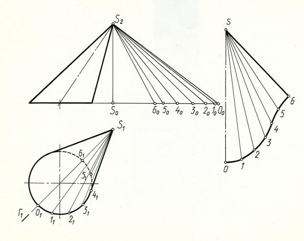 Решение. Как видно из чертежа, основание ABC пирамиды расположено в горизонтальной плоскости и поэтому его стороны на П1 проецируются в натуральную величину. Натуральные размеры боковых ребер определяем с помощью прямоугольных треугольников, у которых одним катетом является превышение точки S над точками А, В, С (отрезок S2S0), a вторым катетом отрезок, равный горизонтальной проекции соответствующего бокового ребра (S0A0=S1A1, S0B0=S1B1, S0C0= S1C1). Натуральной величиной боковых ребер являются отрезки S2A0, S2B0, S2C0. После определения натуральных величин ребер приступаем к построению развертки. Для этого из произвольной точки S проводим произвольную прямую а. Откладываем на ней от точки S-SA=S2A0. Из точки А проводим дугу радиусом A1C1, а из точки S-дугу радиусом S2C0. Пересечение дуг определяет положение вершины В треугольника SАВ-натуральной величины грани пирамиды. Аналогично находим точки B и А. Соединив точки А С В A S, получим развертку боковой поверхности пирамиды SABC. Пример 2. Построить развертку боковой поверхности наклонного эллиптического конуса с круговым основанием (рис. 12.3). Развертка конической поверхности выполняется по схеме построения развертки боковой поверхности пирамиды, способу треугольников. Для этого коническая поверхность аппроксимируется (заменяется) вписанной в нее многогранной пирамидальной поверхностью. Решение. В данную коническую поверхность впишем двенадцатиугольную пирамиду. Так как коническая поверхность имеет плоскость симметрии Г, то можно построить развертку только одной половины поверхности. Разделим половину окружности на 6 равных частей, начиная от точки (O1) пересечения ее с плоскостью симметрии Г (Г1), которая делит поверхность и, следовательно, ее развертку на 2 симметричные части. Через точки деления O1l1, 21 ... и вершину S1 проводим горизонтальные проекции образующих конуса- прямые S1O1, S111, S121..., которые являются боковыми ребрами вписанной пирамиды. Сторонами основания пирамиды являются хорды, соединяющие точки деления и проецирующиеся на П1 в натуральную величину. Натуральную величину боковых ребер определяем способом прямоугольных треугольников. Проводим ось симметрии развертки и от точки S откладываем отрезок SO=S2О0 (pиc. 11.3). Из точки S радиусом S210 проводим дугу окружности, а из точки О радиусом О111 делаем на ней засечку. Точка 1 – искомая точка развертки. Для построения смежной грани из точки S радиусом S220, а из точки 1 радиусом 1121 сделаем засечки и в пересечении отметим точку 2 и т.д. Соединив точки 0,1, 2... 6 плавной кривой получим развертку ½ боковой поверхности конуса.