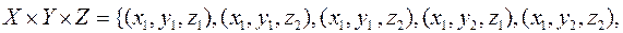Рассмотрим множества ,и : , , . Составим декартово произведение трёх множеств , и :
