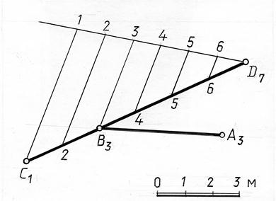 Рис. 14.13 Решение. Искомая горизонтальная прямая определяется точкой А(А3) и точкой В(В3) на прямой СD, имеющей такую же отметку. Проградуируем прямую СD, применяя пропорциональное деление отрезка. Построенную проекцию В3 соединим с проекцией А3. Прямая АВ(А3В3) – искомая.
