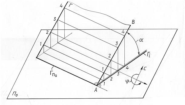 Рис. 14.15 Отметка горизонтали – высота горизонтали над плоскостью проекций (на рис. 14.15 горизонтали проведены соответственно с отметками 1,2,3 единицы масштаба). След плоскости ГП0 является горизонталью с нулевой отметкой. Линия наибольшего ската плоскости иначе называется линией падения АВ (рис. 14.15) – прямая, принадлежащая плоскости и перпендикулярная ее горизонталям (АВ ⊥ ГП0). Она определяет угол наклона и угол падения плоскости. Так как линия наибольшего ската перпендикулярна горизонталям, то масштаб уклона плоскости (проекция линии наибольшего ската) тоже перпендикулярен проекциям горизонталей (теорема об ортогональном проецировании прямого угла). Изображение плоскости Г масштабом уклона плоскости показано на рис. 14.16. Масштаб уклона плоскости изображается двумя параллельными прямыми (толстой и тонкой) и обозначается той же буквой, что и плоскость, с нижним индексом i -Гi.