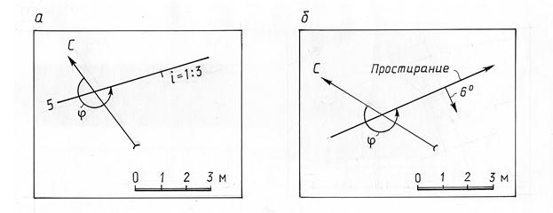 Перпендикулярно масштабу уклона плоскости проводятся проекции горизонталей. Вдоль масштаба уклона плоскости (со стороны тонкой линии) указываются отметки этих горизонталей. Цифры числовых отметок проставляются так, чтобы их верх был ориентирован в сторону подъёма плоскости. Расстояния между соседними делениями масштаба уклона l, соответствующие единице превышения, являются интервалом линии наибольшего ската, а, следовательно, и интервалом плоскости. Угол падения плоскости a0 - угол наклона плоскости к плоскости проекций (угол наклона линии наибольшего ската к плоскости проекций). На чертеже в проекциях с числовыми отметками угол падения a определяется из прямоугольного треугольника, у которого один катет равен интервалу линии наибольшего ската, а второй катет равен единице высоты в масштабе чертежа (см. рис. 14.16). Уклон плоскости – тангенс угла падения плоскости. Уклон плоскости равен уклону линии наибольшего ската. Уклон плоскости есть, величина, обратная интервалу плоскости. Для решения инженерных задач на земной поверхностинеобходимо ориентировать заданную плоскостьотносительно меридиана Земли. Для этого вводят понятия: направление простирания плоскости – правое направление ее горизонталей, если смотреть на плоскость в сторону возрастания отметок; угол простирания плоскости – угол j между меридианом земли и направлением простирания (см. рис. 14.15, 14.16). Угол простирания измеряют от северного конца меридиана против часовой стрелки до направления простирания плоскости. Плоскость задана горизонталью 5, уклоном i=1:3 и направлением спуска, которое обозначено штрихом в сторону спуска. Такой штрих называется бергштрихом (рис. 14.17а).