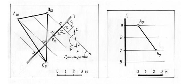 На чертеже в проекциях с числовыми отметками (рис. 14.22а,б,в) масштабы уклонов параллельных плоскостей должны быть параллельны, иметь равные интервалы, а отметки должны возрастать в одном и том же направлении. Признаком параллельности плоскостей является также равенство их углов простирания и уклонов (углов падения).