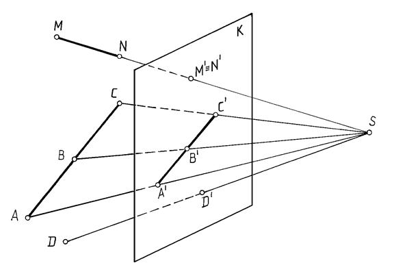 Лекция 16 Перспектива Центральное проектирование Аппарат линейной перспективы. Перспектива прямой. Построение перспективы прямой принадлежащей предметной плоскости Построение перспективы точки принадлежащей предметной плоскости. Построение перспективы отрезка прямой принадлежащей предметной плоскости Чтобы получить центральную проекцию геометрической фигуры на плоскости проекций К (рис. 16.1), необходимо: 1. через точки фигуры провести проецирующие лучи так, чтобы они проходили через центр проекции – точку S; 2. определить точки пересечения проецирующих лучей с плоскостью проекций К.