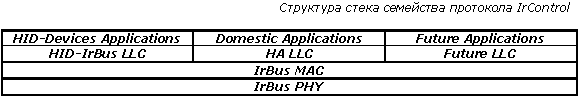 VFIR (Very Fast IR) – дополнение к стандарту IrDA, позволяющее повысить скорость передачи данных до 16Mbps. Введен новый формат фрейма, в котором первым идет поле преамбулы (Preamble), состоящее из 240bit или слотов, после IrLAP-фрейма и контрольной суммы – поле FB (Flush Byte – 8 нулевых бит), в конце – поле Null (24 нулевых бита). Вся переданная информация кодируется по алгоритму HHH, обеспечивающему от 1 до 13 пустых слотов между импульсами. Конечно, необходимые изменения были сделаны и в протоколе IrLAP: добавлено обозначение для скорости 16Mbps в поле Baud Rate, а также увеличен максимально возможный размер окна с 7 до 127 фреймов. IrBus (IrControl). Спецификация, регулирующая вопросы, связанные с подключением различной периферии, требующей взаимодействия с системными контроллерами. Ее положения применимы также к устройствам удаленного управления ПК, телевизорами высокой четкости (HDTV) и бытовыми приборами. Физический уровень обеспечивает передачу данных, закодированных по схеме модуляции последовательными импульсами 16-PSM (Pulse Sequence Modulation – 8 слотов, где только 2 или 4 могут содержать импульс) со скоростью 75Kbps. Однако, при использовании такой схемы кодирования, импульс означает "1", его отсутствие – "0". Частота несущей основного сигнала – 1.5MHz с минимальной дальностью действия 5м. Данные пересылаются в пакетах двух видов: длинные (776bit) и короткие (72bit), структура которых абсолютно идентична за исключением значения стартового флага, а также разрядности контрольной суммы. Так, протокол MAC (Media Access Control) регламентирует процессы взаимодействия множественной периферии с единственным основным устройством (Host) и обмена информацией между ними.