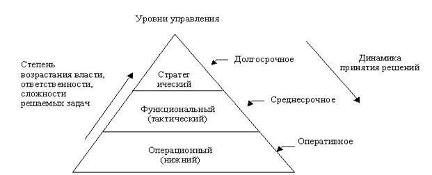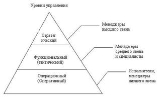 Операционный (нижний) уровень управления обеспечивает решение многократно повторяющихся задач и операций и быстрое реагирование на изменения входной текущей информации. На этом уровне достаточно велики как объем выполняемых операций, так и динамика принятия управленческих решений. Этот уровень управления часто называют оперативным из-за необходимости быстрого реагирования на изменение ситуации. На уровне оперативного (операционного) управления большой объем занимают учетные задачи. Пример 2. Некоторые учетные задачи: · учет количества приданной продукции; · учет затрат времени, сырья и материалов при выполнении отдельных производственных операций; · учет произведенной продукции; · бухгалтерский учет и т.д. Функциональный (тактический) уровень управления обеспечивает решение задач, требующих предварительного анализа информации, подготовленной на первом уровне, На этом уровне большое значение приобретает такая функция управления, как анализ. Объем решаемых задач уменьшается, но возрастает их сложность. При этом не всегда удается выработать нужное решение оперативно, требуется дополнительное время на анализ, осмысление, сбор недостающих сведений и т.п. Управление связано с некоторой задержкой от момента поступления информации до принятия решений и их реализации, а также от момента реализации решений до получения реакции на них. Пример 3. На основании анализа статистических данных по спросу на продукцию, о ценах конкурентов и пр. прогнозируется прибыль и разрабатывается план выпуска продукции на ближайший период (неделю, месяц, квартал). Результаты принимаемых управленческих решений проявляются спустя некоторое время. Стратегический уровень обеспечивает выработку управленческих решений, направленных на достижение долгосрочных стратегических целей организации. Поскольку результаты принимаемых решений проявляются спустя длительное время, особое значение на этом уровне имеет такая функция управления, как стратегическое планирование. Прочие функции управления на этом уровне в настоящее время разработаны недостаточно полно. Часто стратегический уровень управления называют стратегическим или долгосрочным планированием. Правомерность принятого на этом уровне решения может быть подтверждена спустя достаточно длительное время. Могут пройти месяцы или годы. Ответственность за принятие управленческих решений чрезвычайно велика и определяется не только результатами анализа с использованием математического и специального аппарата, но и профессиональной интуицией менеджеров. Пример 4. На основании анализа финансового состояния фирмы принимаются решения об увеличении (уменьшении, снятии с продажи) производимой продукции, о привлечении дополнительных работников или об их сокращении. Персонал организации Персонал организации - сотрудники разной степени квалификации и уровней управления - от секретарей, выполняющих простейшие типовые операции обработки, до специалистов и менеджеров, принимающих стратегические решения. На рис.3 показано соответствие разных уровней квалификации персонала уровням управления: