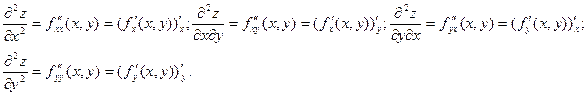 Частные производные функции z = f (x,y) являются, в свою очередь, функциями переменных х и у. Следовательно, можно найти их частные производные по этим переменным. Обозначим их так: