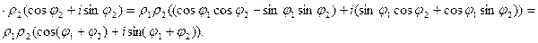 Легко убедиться, что операция сложения комплексных чисел соответствует операции сложения векторов. Рассмотрим геометрическую интерпретацию умножения. Пусть Следовательно, модуль произведения двух комплексных чисел равен произведению их модулей, а аргумент – сумме их аргументов. Соответственно, при делении модуль частного равен отношению модулей делимого и делителя, а аргумент – разности их аргументов. Частным случаем операции умножения является возведение в степень: