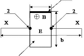 На рис. 17. обозначены: Т-Т – токовые электроды; Х-Х – холловские электроды; 1 – металлические напайки вдоль всего ребра пластины, образующие то- ковые электроды; 2 – точечная приварка холловского электрода к пластине; 3 – полупроводниковая пластина (из арсенида галлия). Величины а, б => 0,8…5 мм. Уравнение преобразования преобразователя Холла имеет вид: