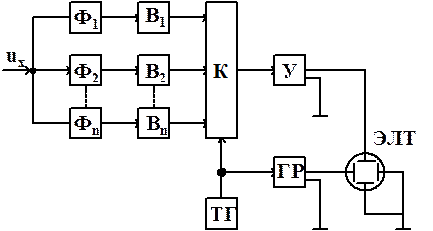 Анализаторы спектра, называемые также анализаторами гармоник, предназначены для исследования спектра амплитуд сигналов. Анализ спектра может производиться двумя способами: первый способ анализа называется последовательным. Поскольку гармоники определяются поочередно; второй способ – параллельным (или одновременным), так как гармоники определяются одновременно. На рисунке приведена структурная схема анализатора спектра, основанная на последовательном способе анализа. Исследуемое напряжение