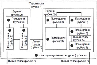 Рис. Семирубежная модель защиты информации Необходимо отметить, что построение СЗИ должно проводиться в соответствии с нормативно-правовой документацией, принятой в РФ. На осуществление большинства видов деятельности в сфере защиты информации необходимы лицензии. Так, для работы с государственной тайной, для работы с криптографическими средствами требуются соответствующие лицензии Федеральной службы безопасности, технические средства должны быть аттестованы Федеральной службой по техническому и экспортному контролю.