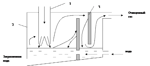 1 – конус раздваивающийся к концу для увеличения скорости движения газа (35 – 50 м/c). 3 – перегородка. Газ подаётся в резервуар, наполненный водой с наклоном для самотока воды. Воздух, с высокой скоростью ударяясь о поверхность воды, разбрызгивает её. Процесс перемешивания. Капельки воды – 300 – 400 мкм. Частички пыли обладая инерцией оседают на капельках воды сталкиваясь с ними. Используется ударный механизм и инерционно - турбулентный (перемешивание и оседание). Во второй половине камеры используется инерционный метод очистки за счёт 2х перегородок.